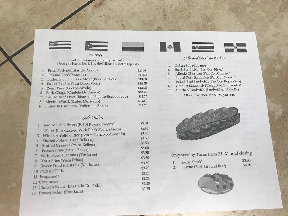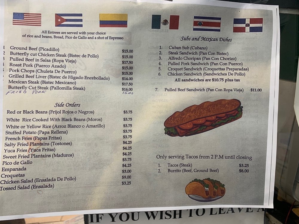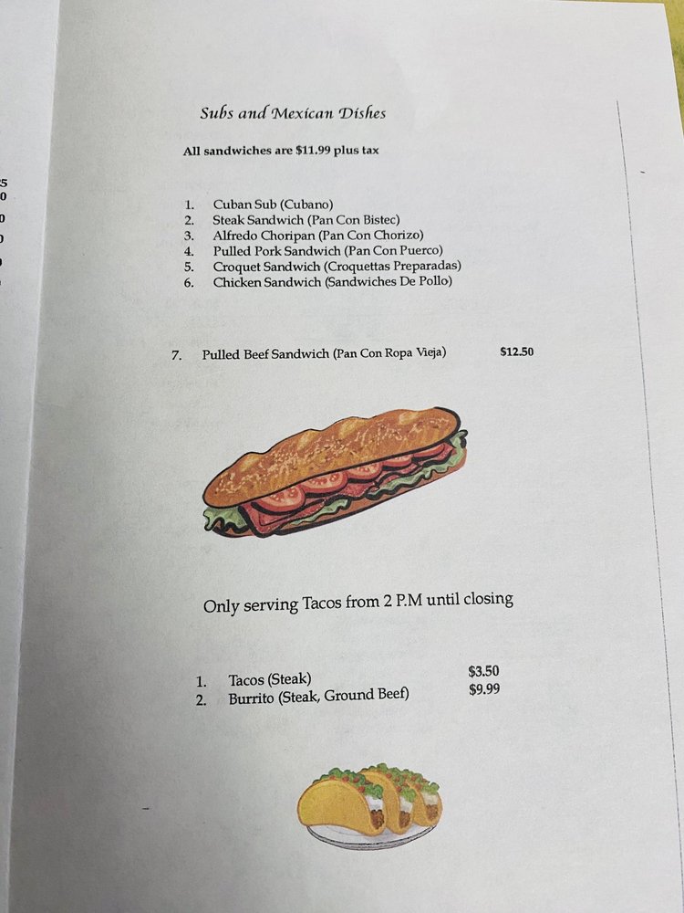 Start your day with hearty breakfast options such as Eggs and Butterfly Cut Steak or Cuban Coffee—available at pocket-friendly prices. Lunch brings an enticing selection of subs and specialties, including the popular Cuban Sandwich and Steak Sandwich (Pan con bistec). Each dish is crafted with passion, ensuring freshness and authenticity. Don't miss their Burritos, available from 2 PM onwards.